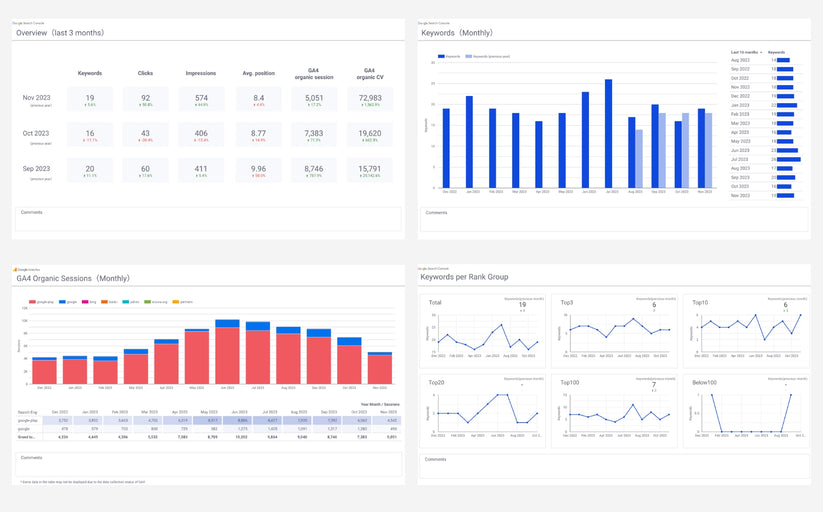 The first page is the most important for verifying the return on investment for SEO, showing sessions and conversions via GA4. This template includes a comment section at the bottom of every page except the cover, so let's also include how to interpret these data as a summary.
