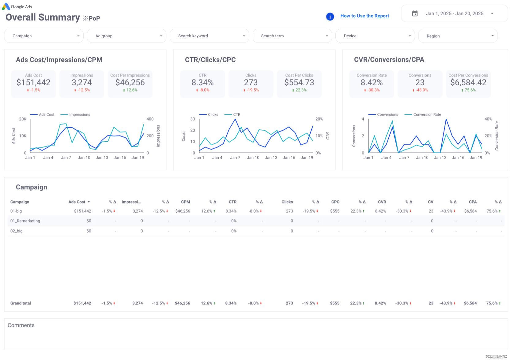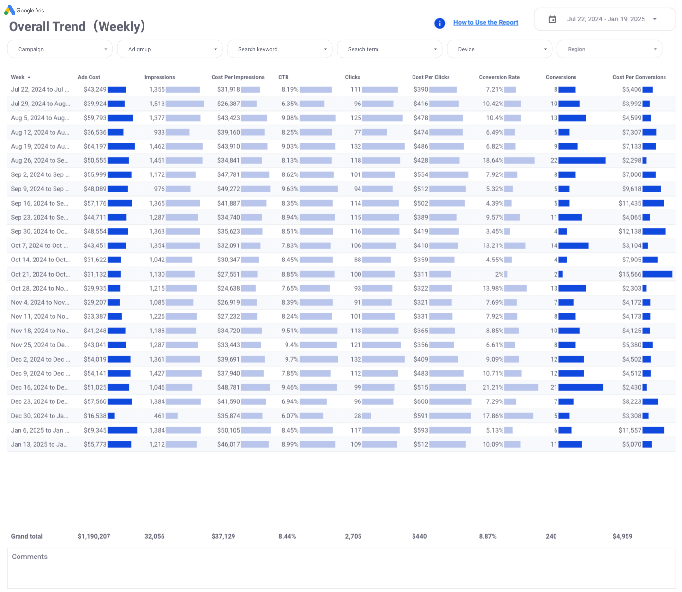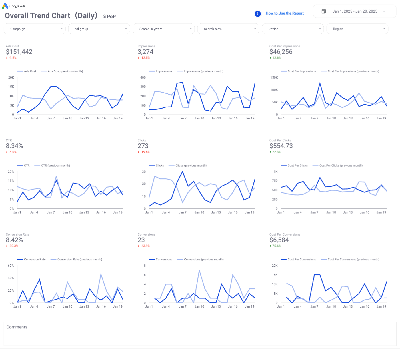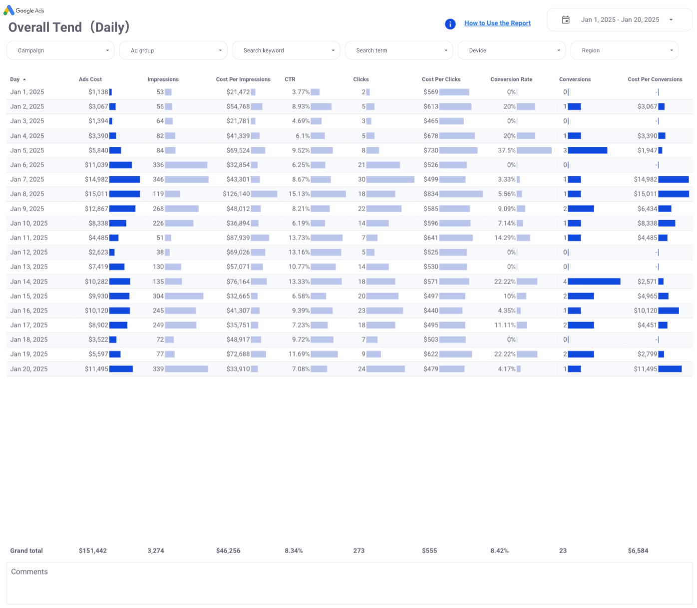This is a versatile Google Ads report template that allows anyone to easily automate Google Ads reporting and daily monitoring. With an overwhelming volume of 51 pages, it caters to various reporting needs (unnecessary pages can be hidden). After a one-time purchase, you can create reports for an unlimited number of accounts. Simply copy the template, and your report will be ready in minutes. Period selection and customization are fully flexible.