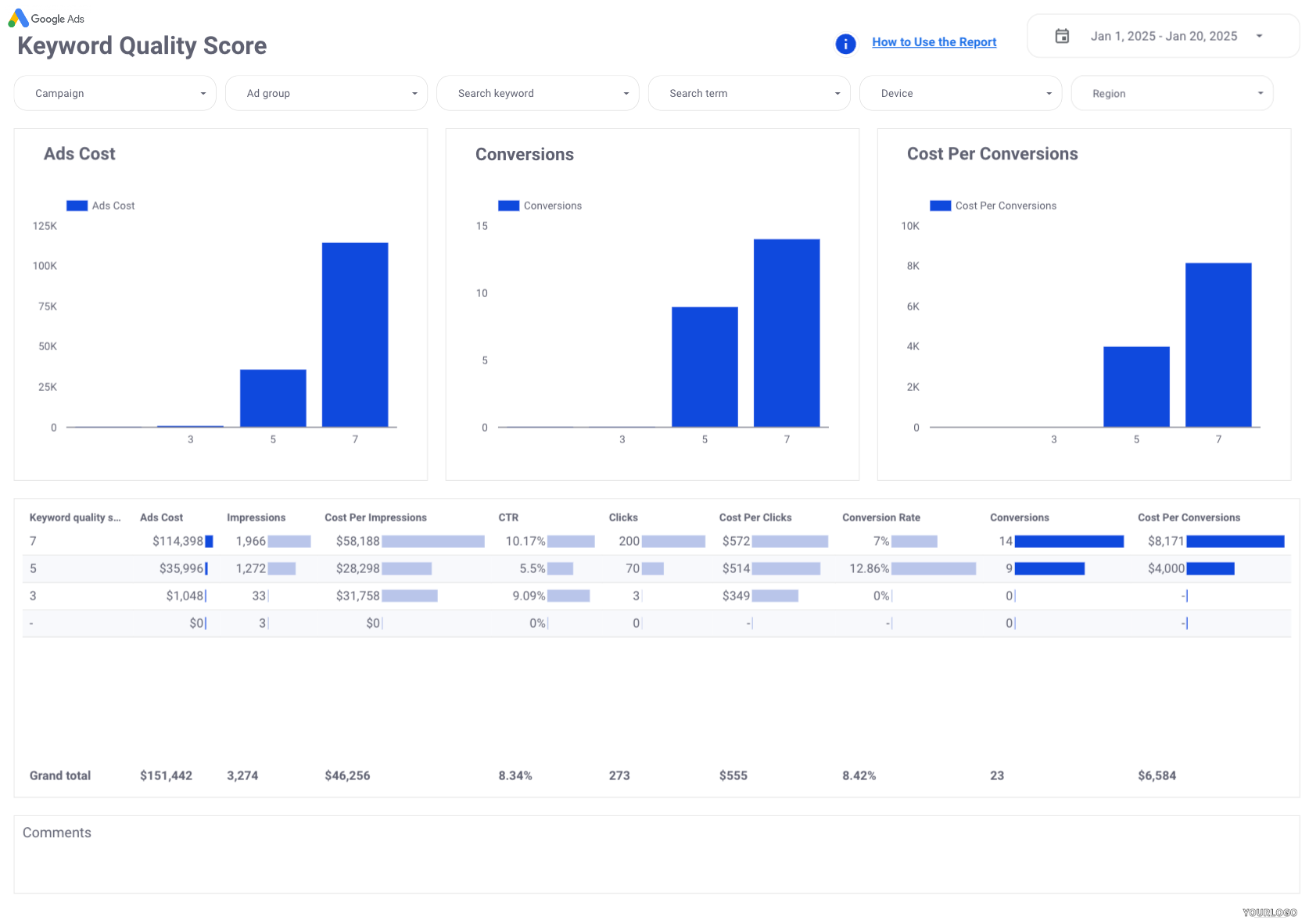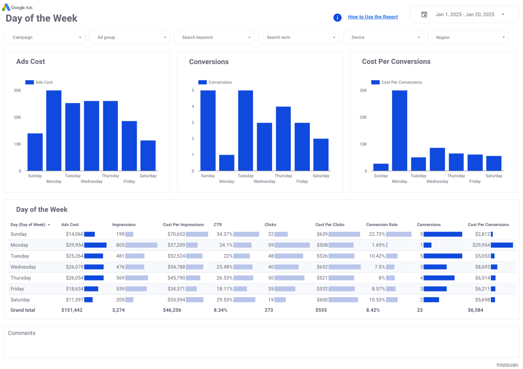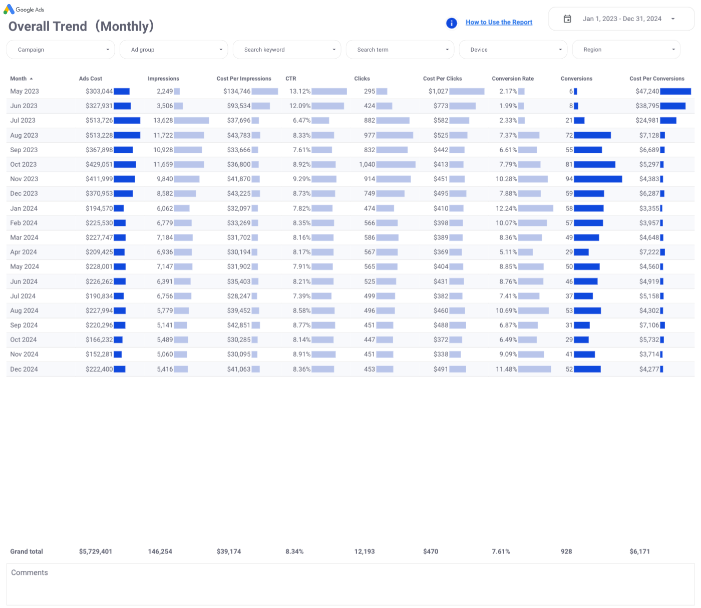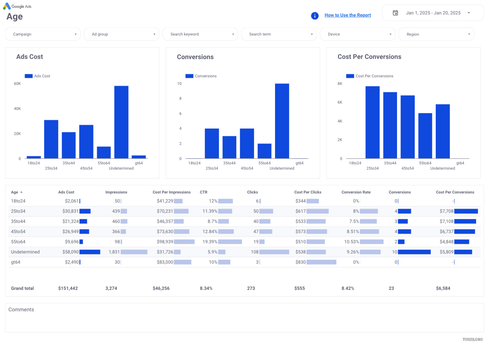 This is a versatile Google Ads report template that allows anyone to easily automate Google Ads reporting and daily monitoring. With an overwhelming volume of 51 pages, it caters to various reporting needs (unnecessary pages can be hidden). After a one-time purchase, you can create reports for an unlimited number of accounts. Simply copy the template, and your report will be ready in minutes. Period selection and customization are fully flexible.