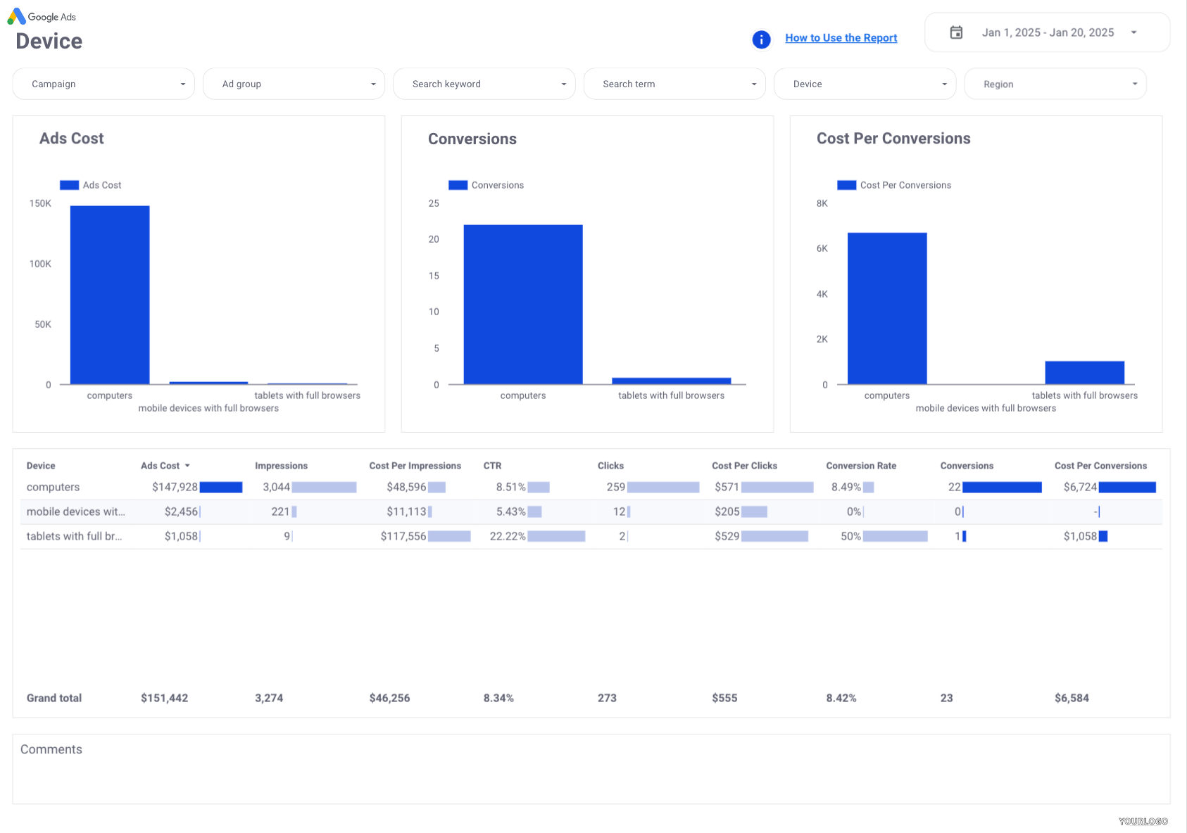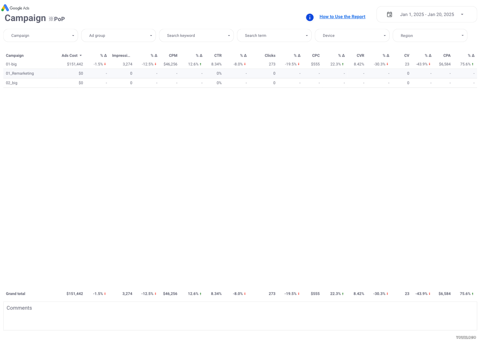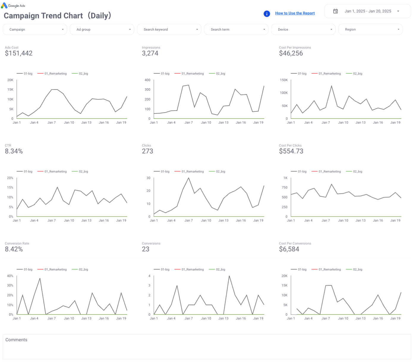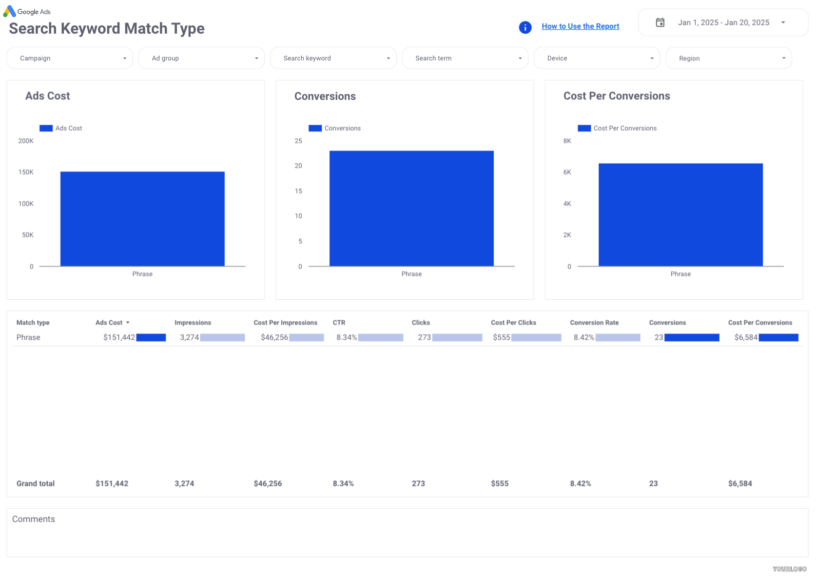 This is a versatile Google Ads report template that allows anyone to easily automate Google Ads reporting and daily monitoring. With an overwhelming volume of 51 pages, it caters to various reporting needs (unnecessary pages can be hidden). After a one-time purchase, you can create reports for an unlimited number of accounts. Simply copy the template, and your report will be ready in minutes. Period selection and customization are fully flexible.