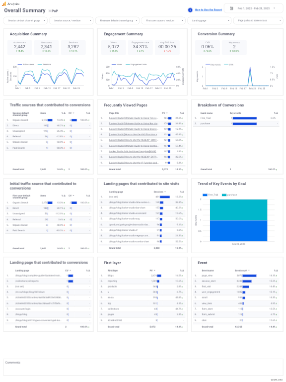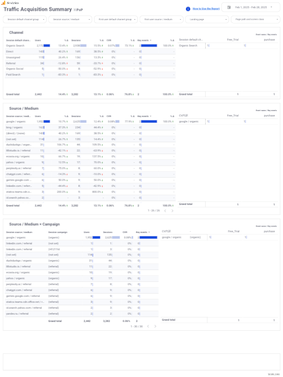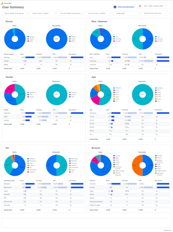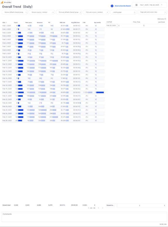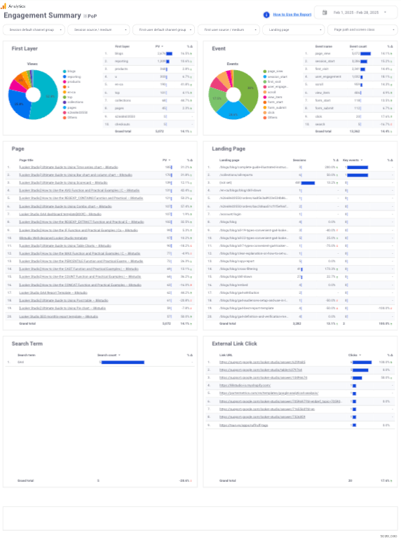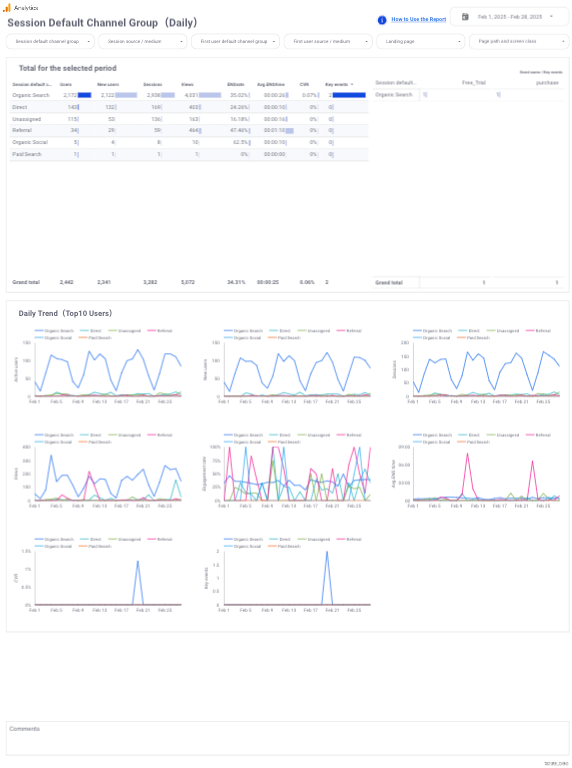 This is a vertical GA4 report template that allows anyone to easily automate GA4 reporting and daily monitoring. Each page is packed with information, and with a total of 68 pages, it provides extensive coverage for various reporting needs (unnecessary pages can be hidden). A single purchase allows unlimited report creation for any number of sites. Reports can be completed in just a few minutes by simply making a copy. Fully customizable with flexible date range selection.