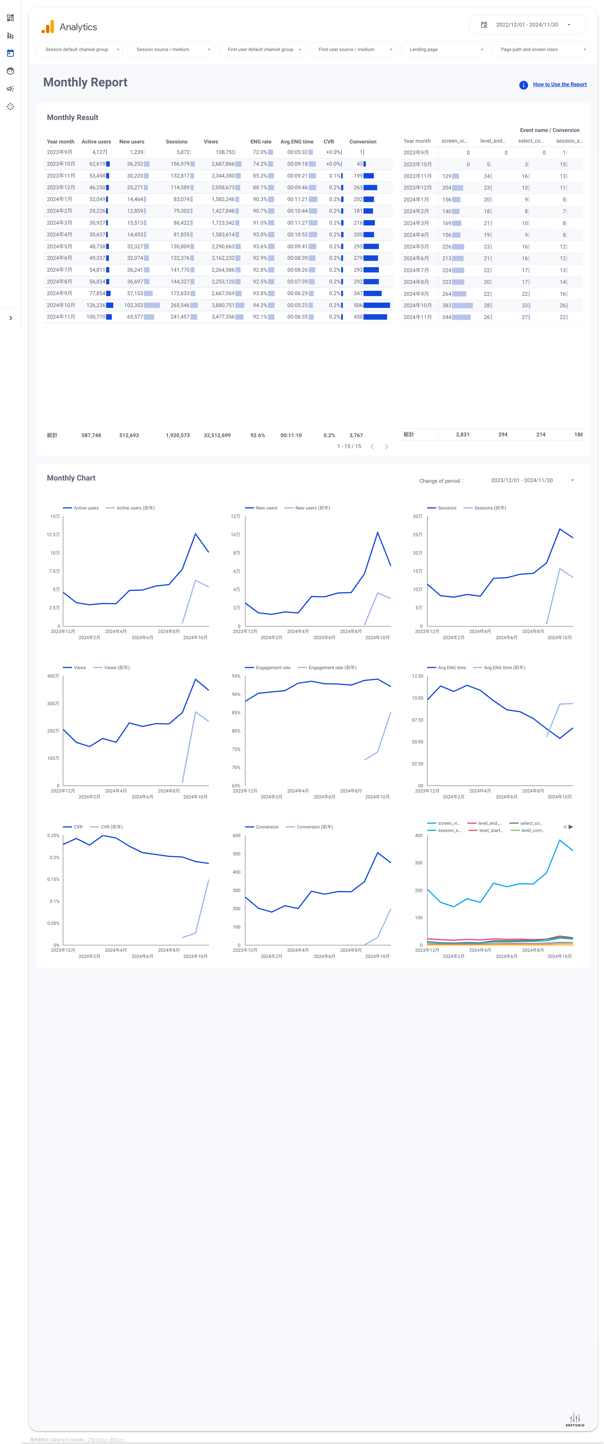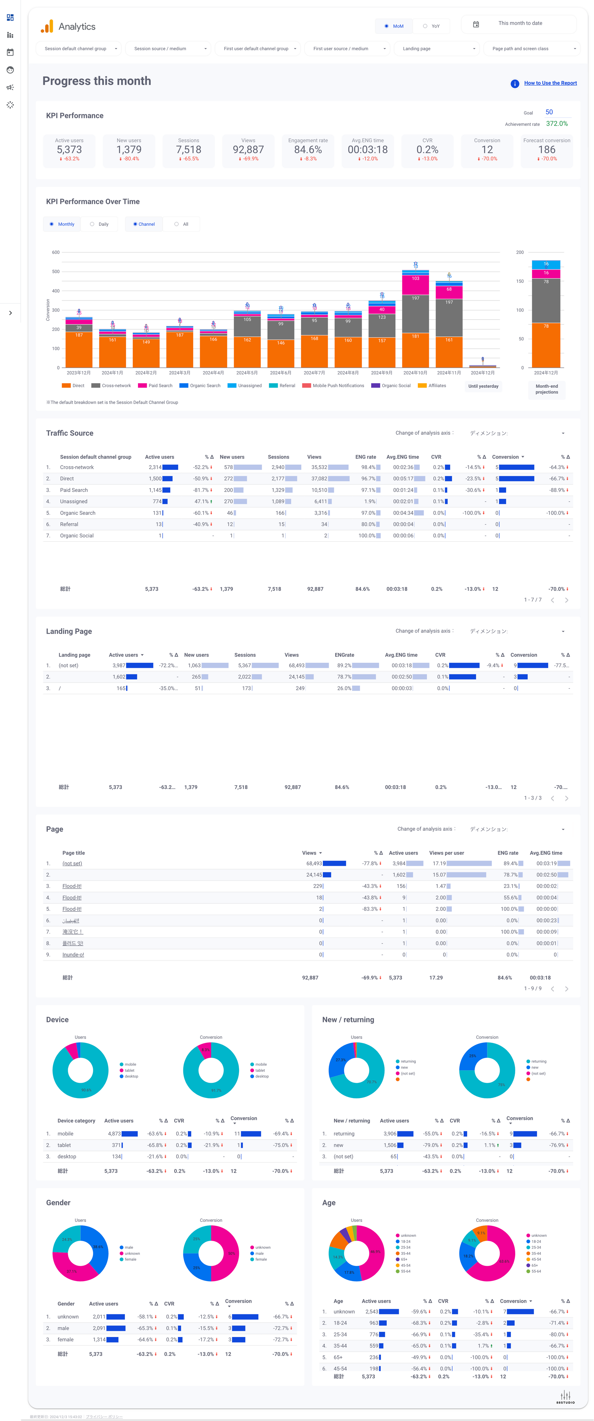 - Progress this month:Monthly, Daily, MoM/YoY,KPI Performance,Traffic Source,Landing Page,Page,Device,New / returning,Gender,Age.
