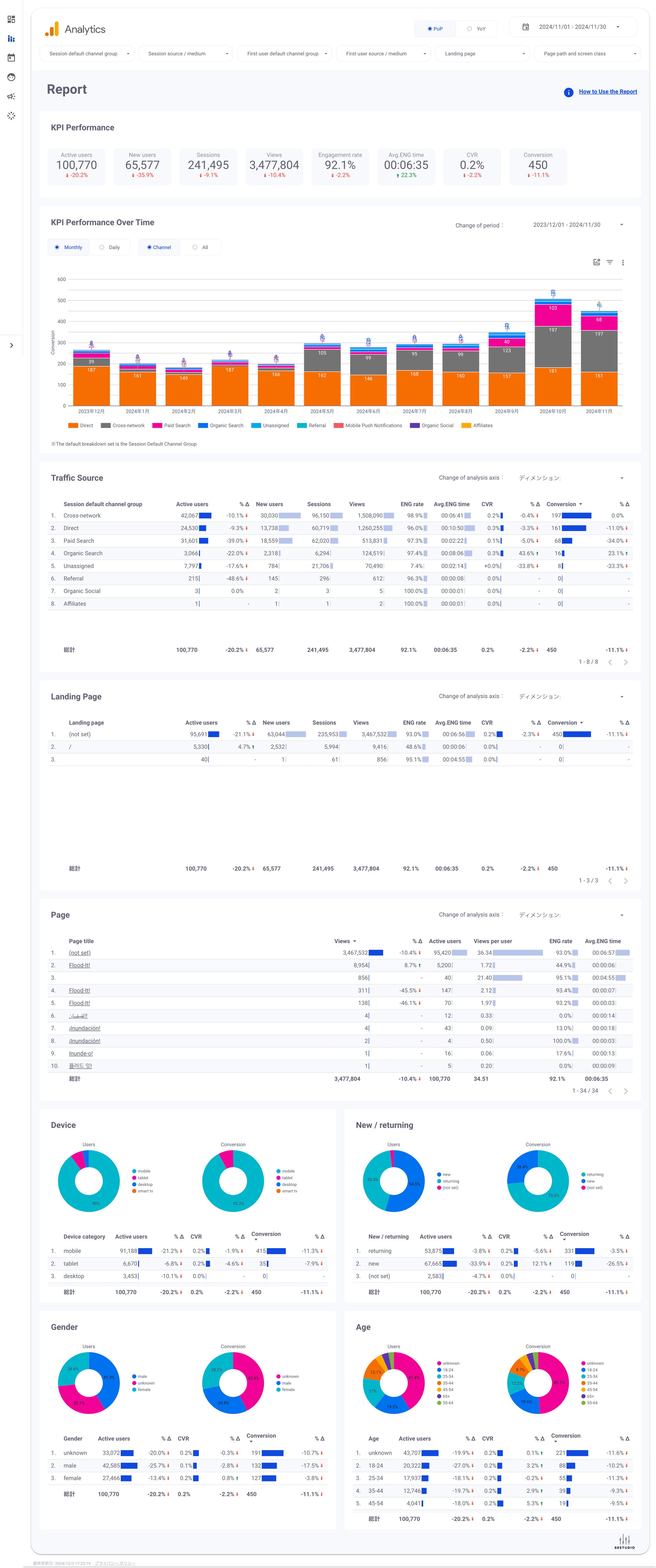 - Report(select period): Monthly, Daily, PoP/YoY,KPI Performance,Traffic Source,Landing Page,Page,Device,New / returning,Gender,Age.
