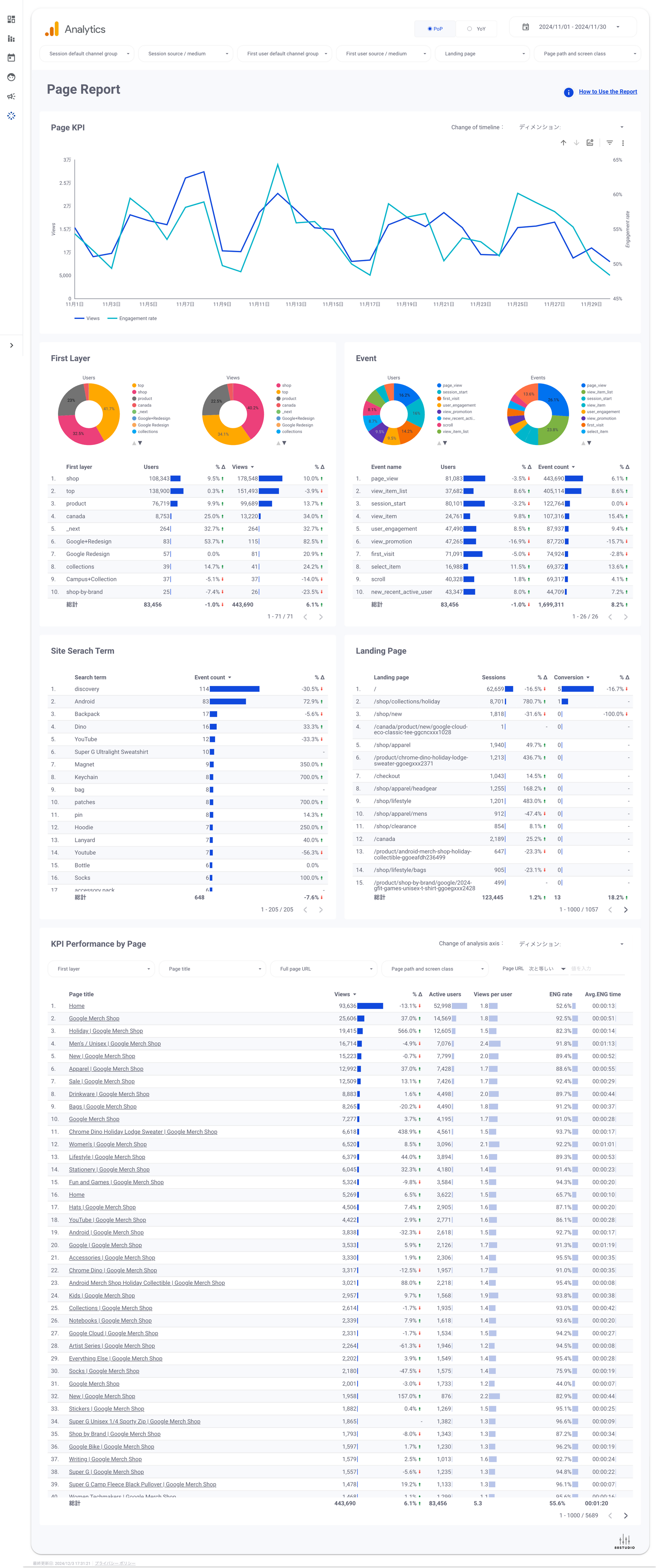 - Page Report(select period): Pop/YoY,Page KPI,Event,Search term,Landing Page.