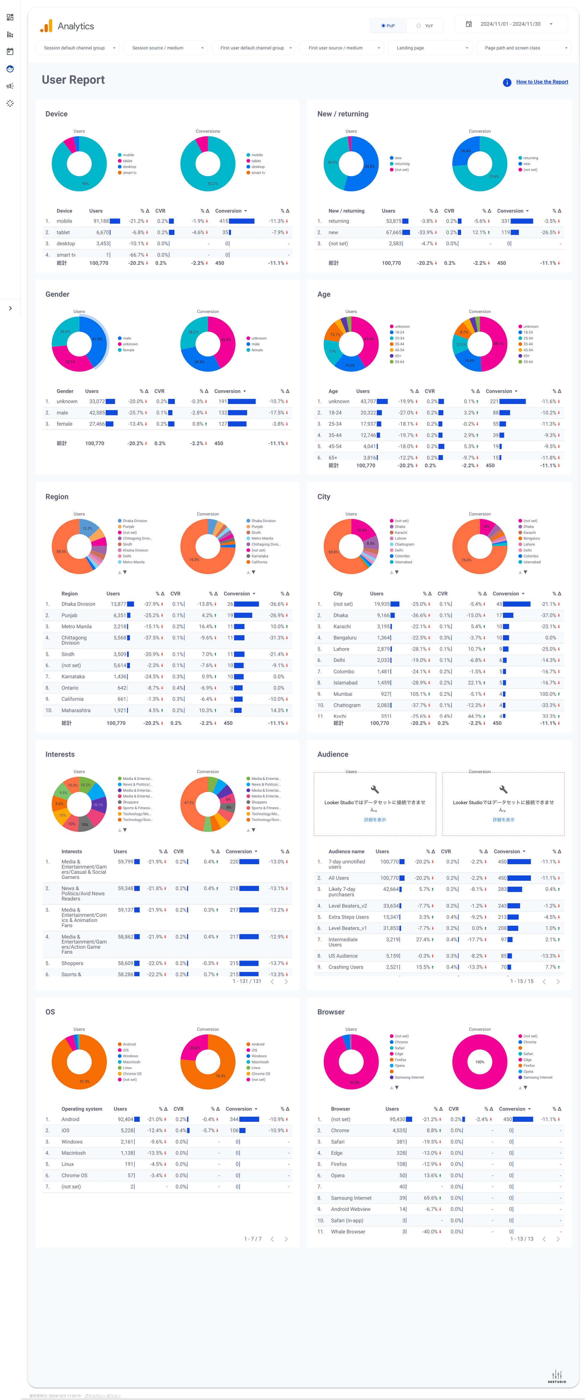 - User Report(select period): Pop/YoY,Device,New / returning,Gender,Age,Region,City,Interests,Audience,OS,Browser.